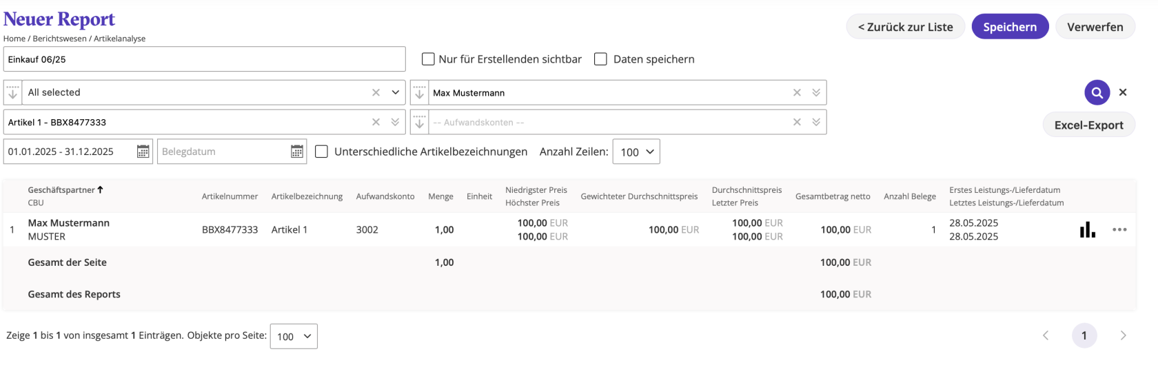 - Filter setzen: Wählen Sie Zeitraum, Standort, Lieferant, Konten oder Artikelbezeichnung