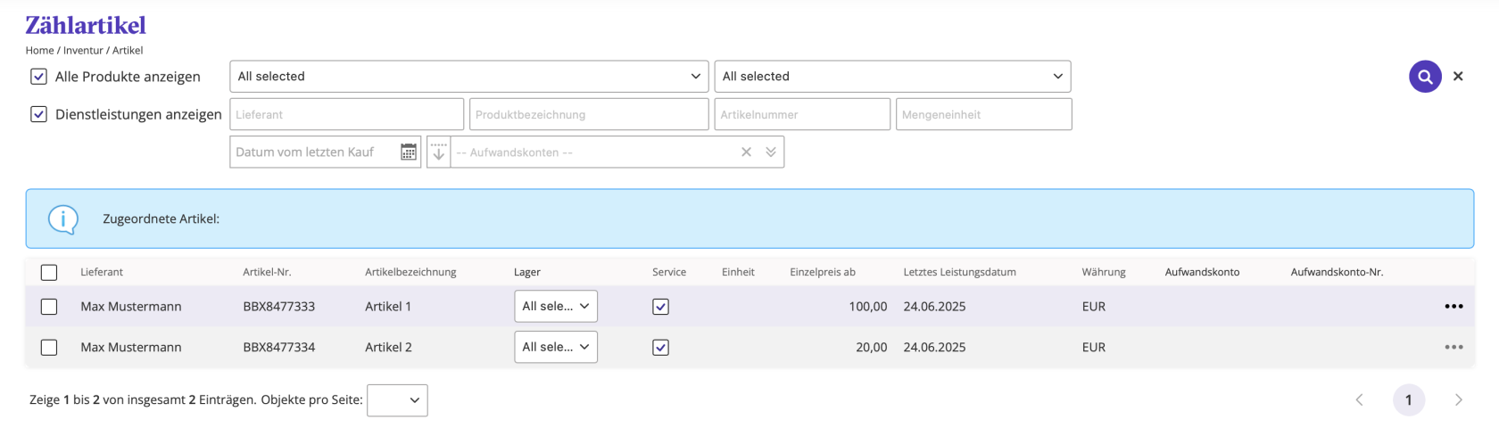 Im Inventur-Bereich finden Sie die Übersicht aller Artikel, die jemals über Rechnungen in Ihr System gelangt sind. Da diese Liste sehr umfangreich sein kann, empfiehlt es sich, die Artikel über Filter einzugrenzen: