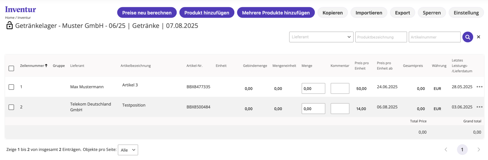 - Jeder Artikel in der Liste kann direkt bearbeitet werden, z. B. durch Eintragen der gezählten Menge.