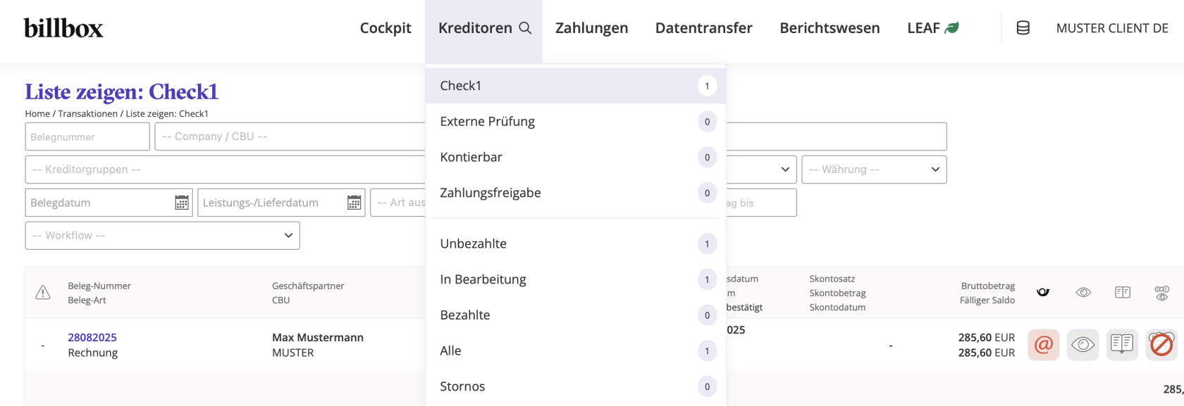 - Navigieren Sie in billbox in den Reiter „Kreditor“.