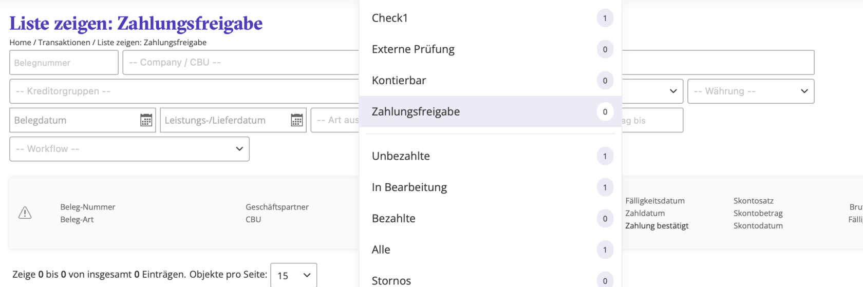 Der Bereich Zahlungsfreigabe ist der letzte Schritt im Workflow vor dem eigentlichen Zahlungslauf. Hier werden alle Belege angezeigt, die bereits sachlich geprüft und kontiert wurden – und jetzt auf die finale Freigabe zur Zahlung warten. Dies der wichtigste Kontrollpunkt, da er sicherstellt, dass nur korrekte und freigegebene Rechnungen tatsächlich bezahlt werden.
