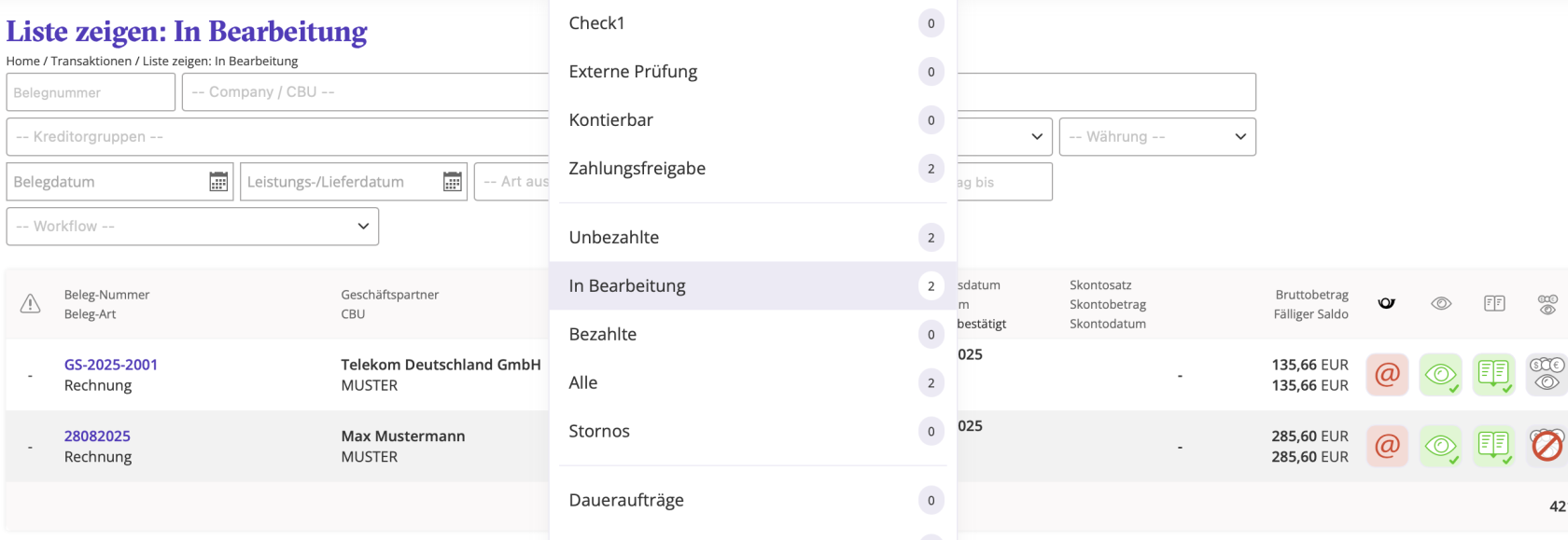 Der Bereich In Bearbeitung zeigt alle Rechnungen, die sich derzeit in einem aktiven Workflow-Schritt befinden. Das bedeutet, dass sie zwar bereits im System sind, aber noch nicht final freigegeben oder abgeschlossen wurden.