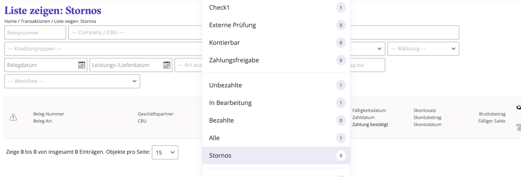 In der Ansicht „Stornos“ sehen Sie alle Belege, die storniert wurden – das heißt: Diese Rechnungen wurden aus dem Workflow genommen und gelten nicht mehr als relevant für die Zahlung oder Buchung.