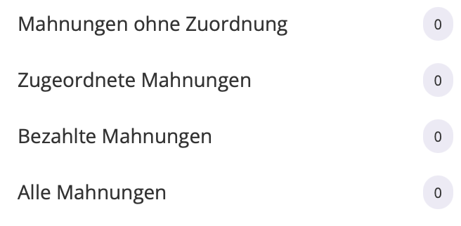 - Nutzen Sie die Filter, um z. B. nur unbezahlte Mahnungen oder nur Mahnungen mit Zuordnung anzuzeigen