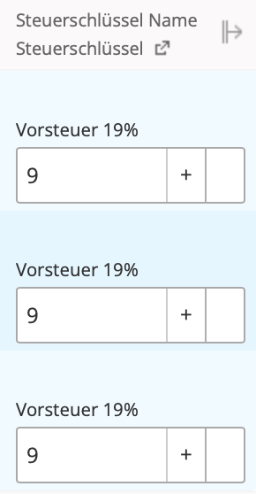 Für DATEV ist z. B. der Steuerschlüssel 9 für 19 % USt. und 8 für 7 % USt. hinterlegt. Diese werden automatisch vorgeschlagen.