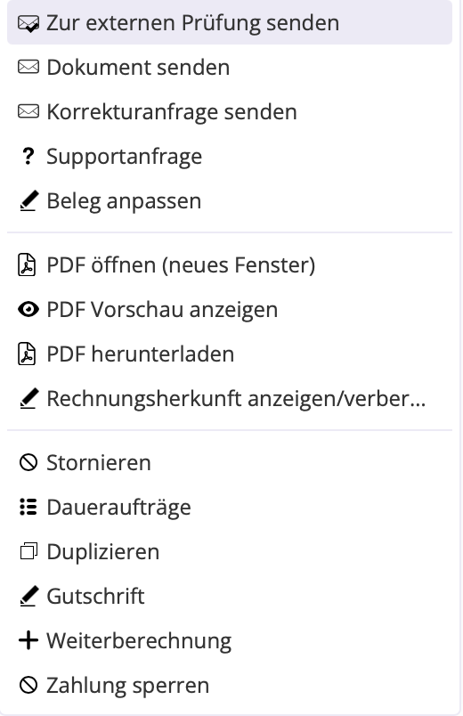 - Zur externen Prüfung senden – leiten Sie den Beleg an eine externe Instanz weiter, z. B. Steuerberater oder Prüfer.