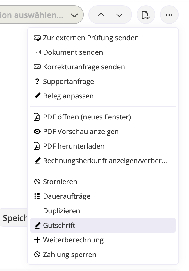 - Gutschrift erstellen → Damit erzeugen Sie einen Stornobeleg, um den ursprünglichen Beleg vollständig auszugleichen.